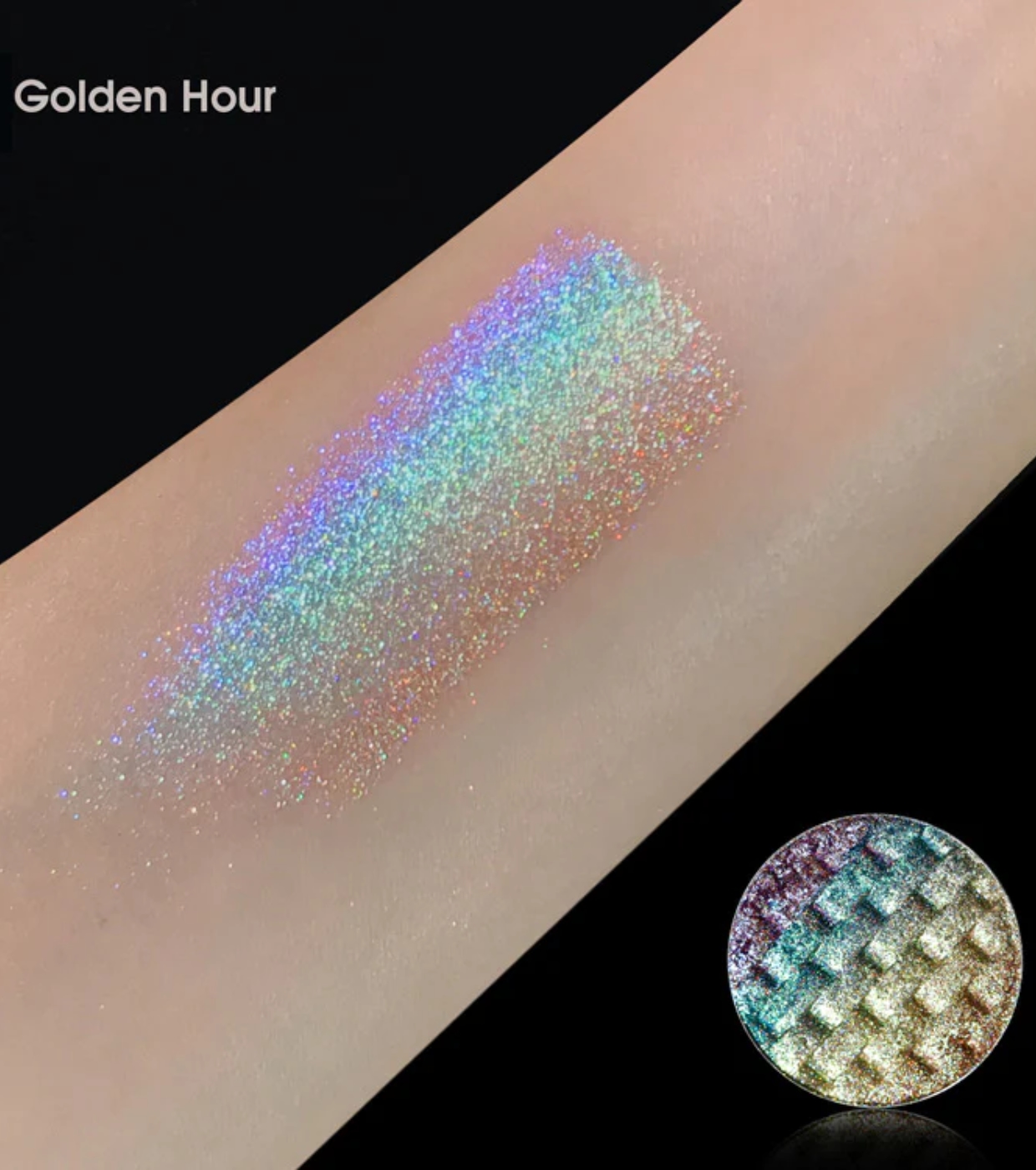 Il change de teinte à chaque mouvement, révélant des paillettes irisées allant du rose au vert citron, au bleu ciel et à l'or irisé, créant un effet arc-en-ciel unique.