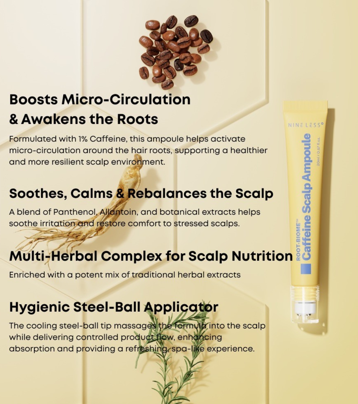 Renforcez et nourrissez votre biome capillaire naturel avec cette ampoule intensive pour le cuir chevelu de Nineless , formulée avec de la caféine et enrichie en panthénol et en menthol pour procurer une sensation immédiate de fraîcheur et de soulagement.
