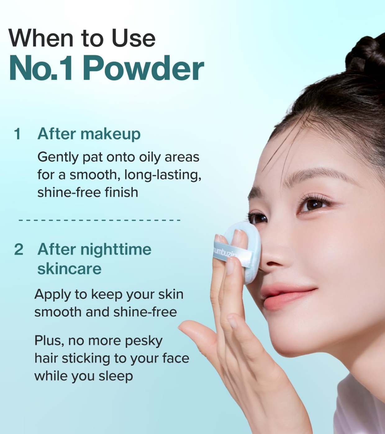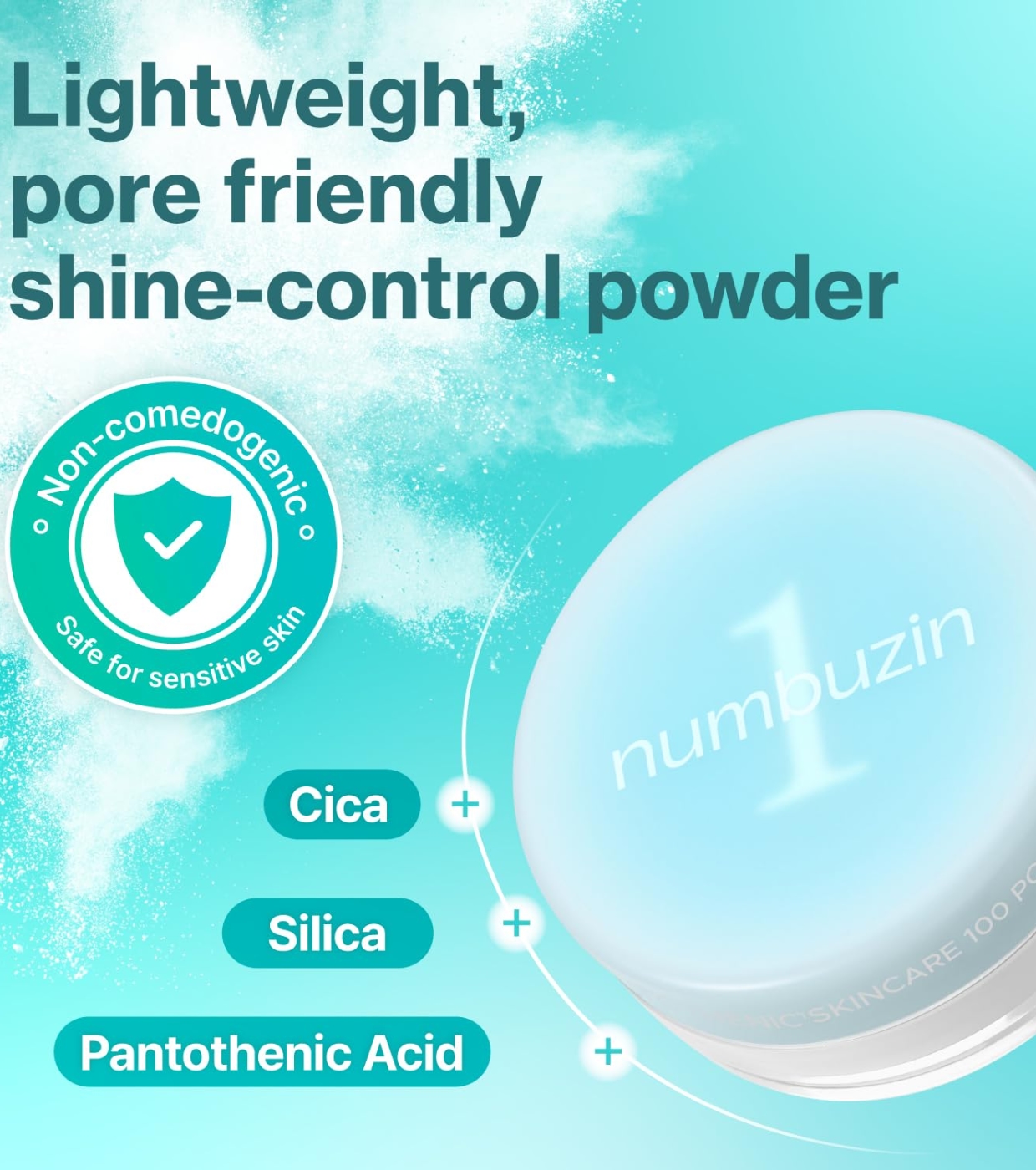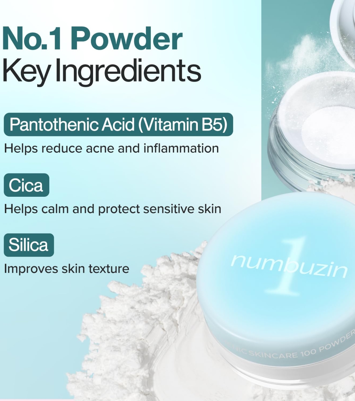 Obtenez une peau lisse, sans brillance et soignée avec la poudre matifiante No.1 Pantothenic Skincare 100 de Numbuzin, une poudre matifiante qui non seulement perfectionne le fini de votre maquillage, mais traite également votre peau.