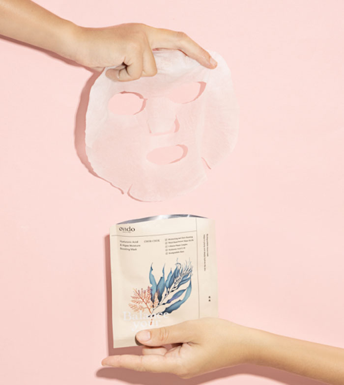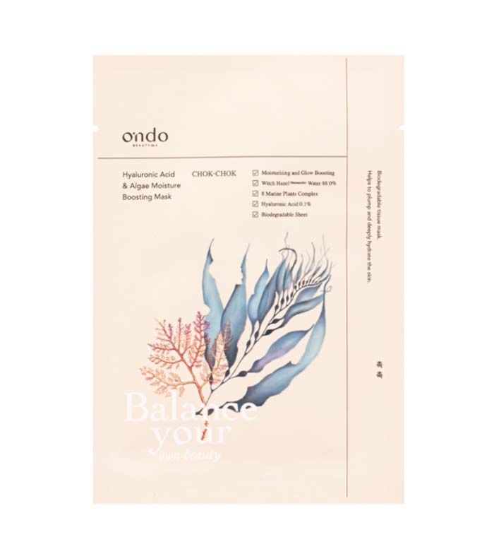La Mascarilla Hidratante Chok-Chok Hyaluronic Acid & Algae de Ondo Beauty 36.5 está fabricada con un tejido biodegradable y contiene un 88% de agua de hamamelis, complejo de 8 plantas marinas y niacinamida, los cuales ayudan a rellenar e hidratar profundamente la peau.