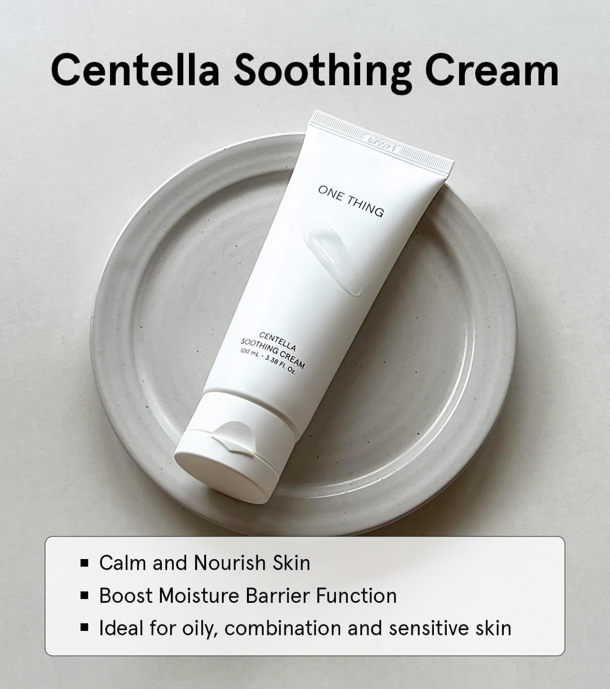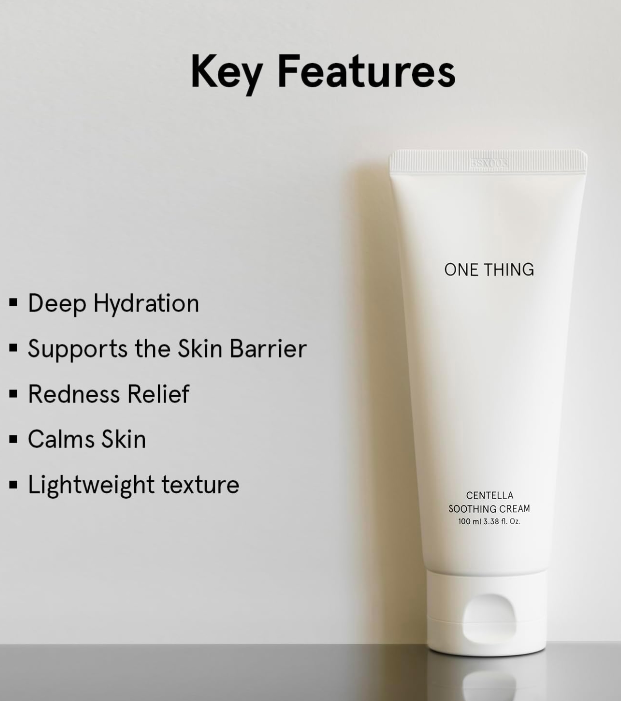 La crème apaisante Centella de One Thing est une crème hydratante légère conçue pour soulager les irritations causées par des facteurs externes et procurer un confort immédiat à la peau.