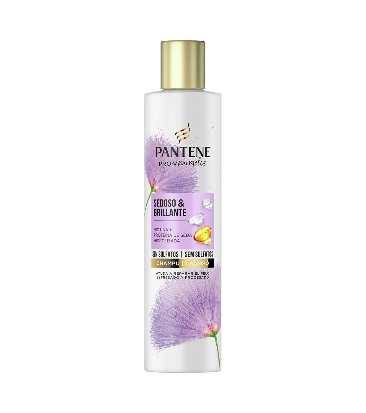 Le shampooing Silky & Shiny sans sulfate Pro-V Miracles à la biotine + protéine de soie hydrolysée est idéal pour les cheveux excessivement abîmés et méchés.