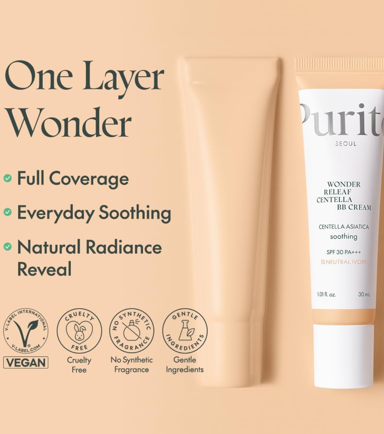 Unifiez votre teint, masquez les imperfections et protégez-le du soleil avec cette BB Cream Wonder Releaf Centella SPF30 de Purito .