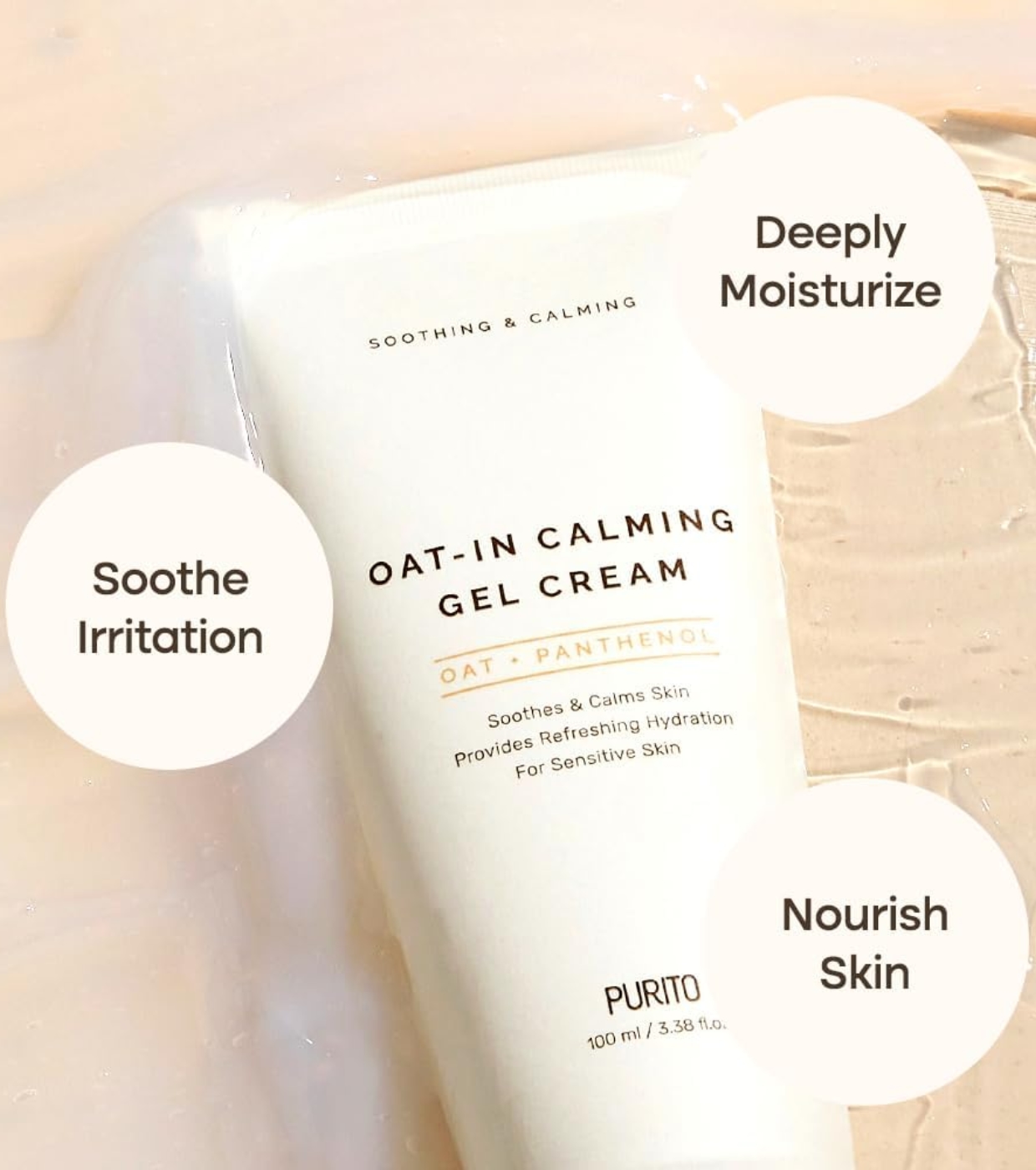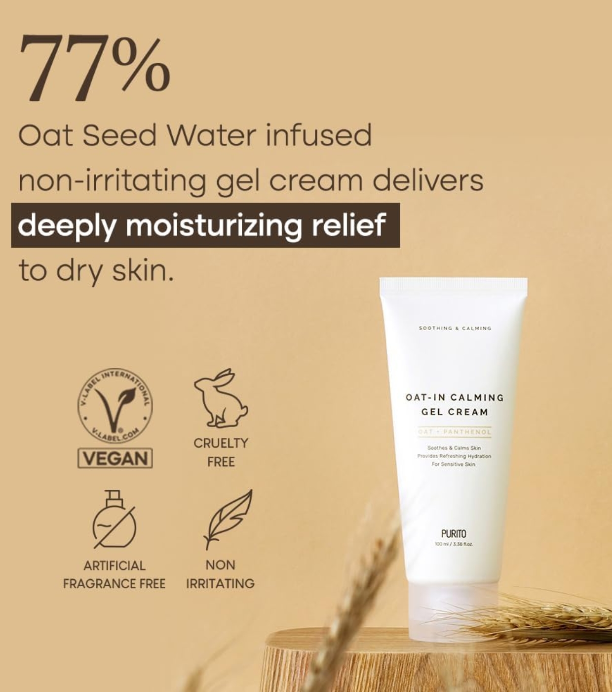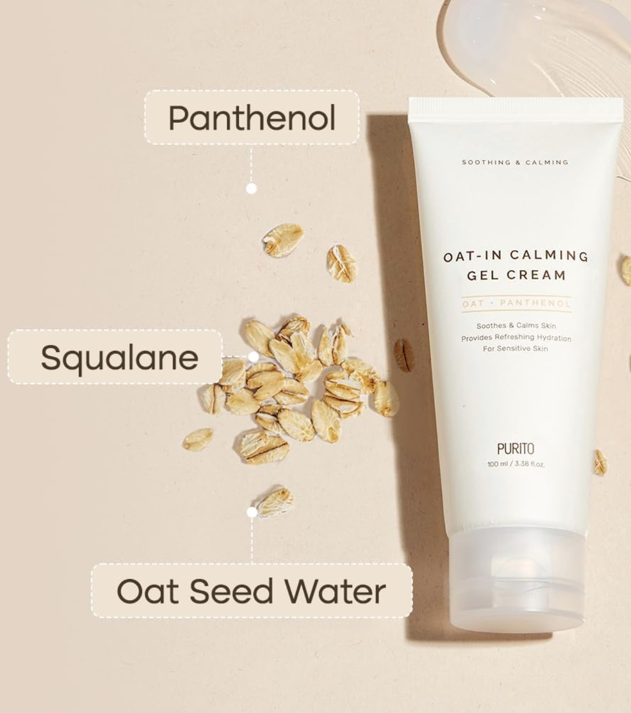 Hydratez, apaisez et protégez votre peau avec une formule légère et revitalisante avec la crème gel apaisante pour le visage Oat-in + Panthenol Purito .