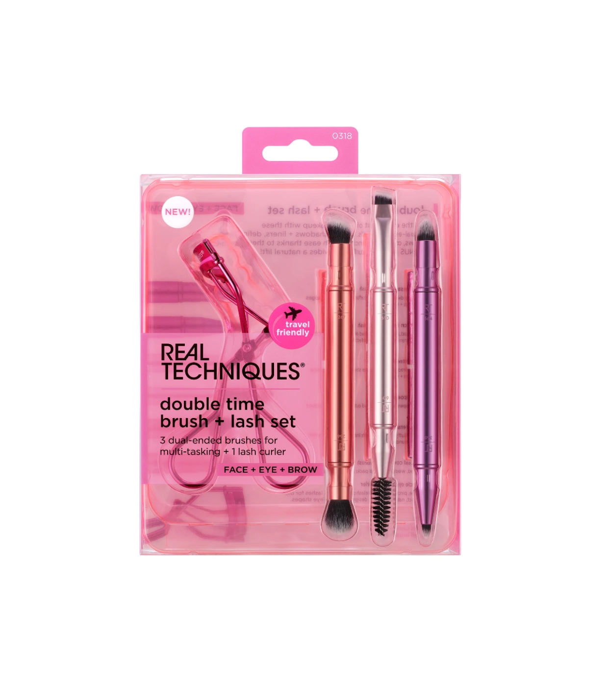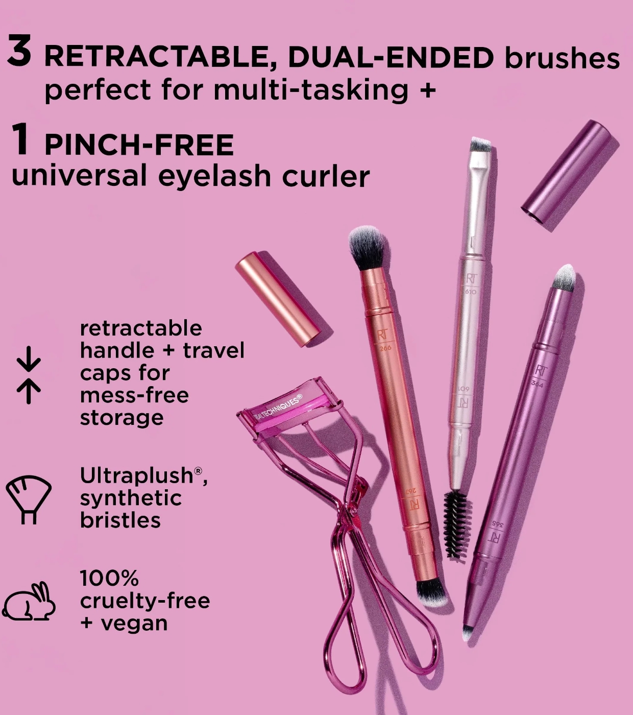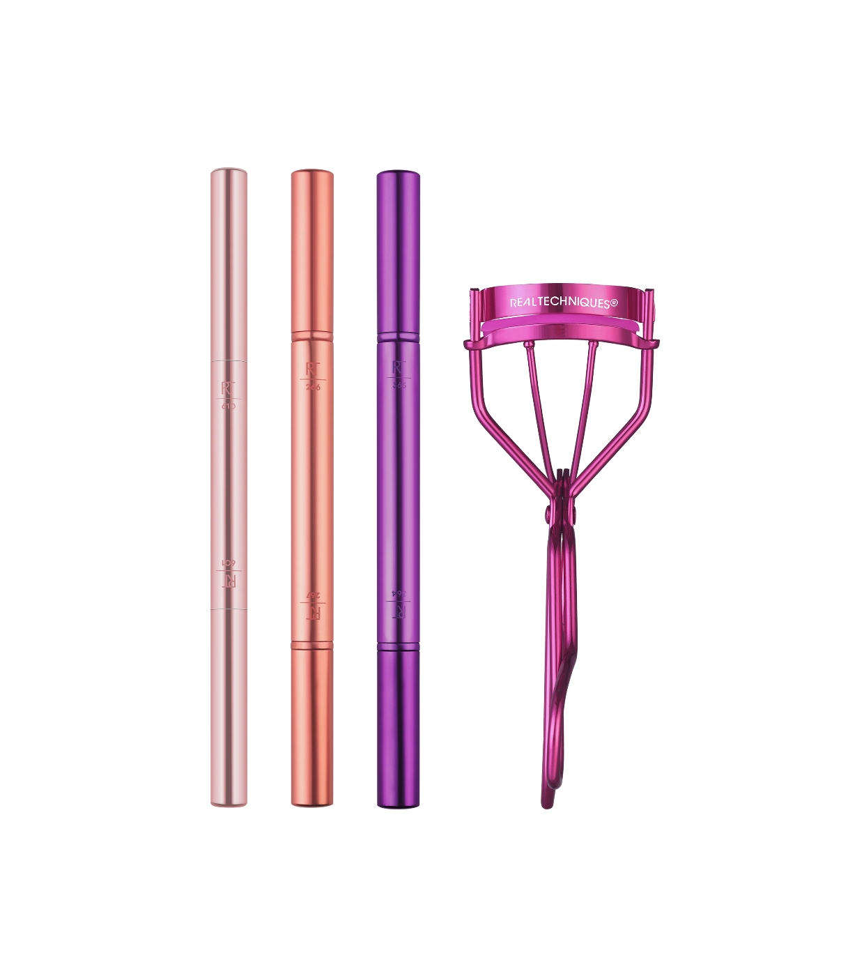 Cet ensemble de voyage tout-en-un Real Techniques Real Techniques comprend 3 pinceaux à double extrémité et un recourbe-cils Miracle, parfaits pour définir, estomper et perfectionner vos yeux en déplacement.