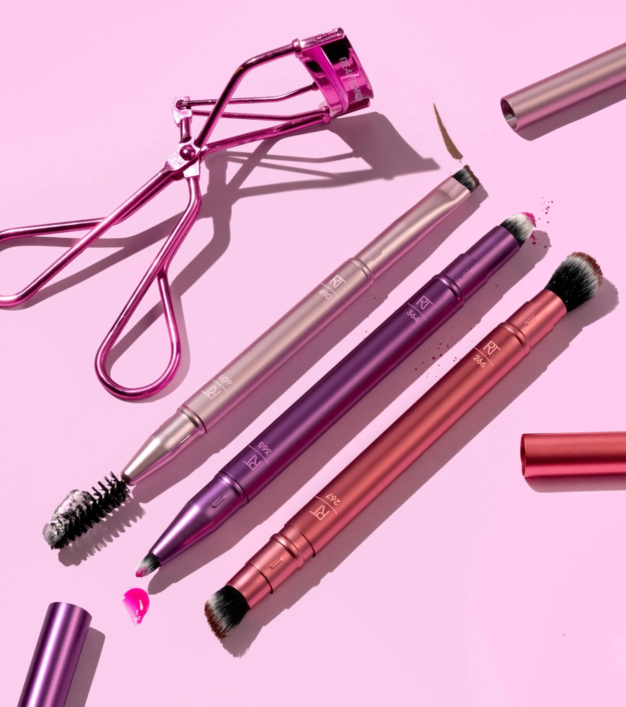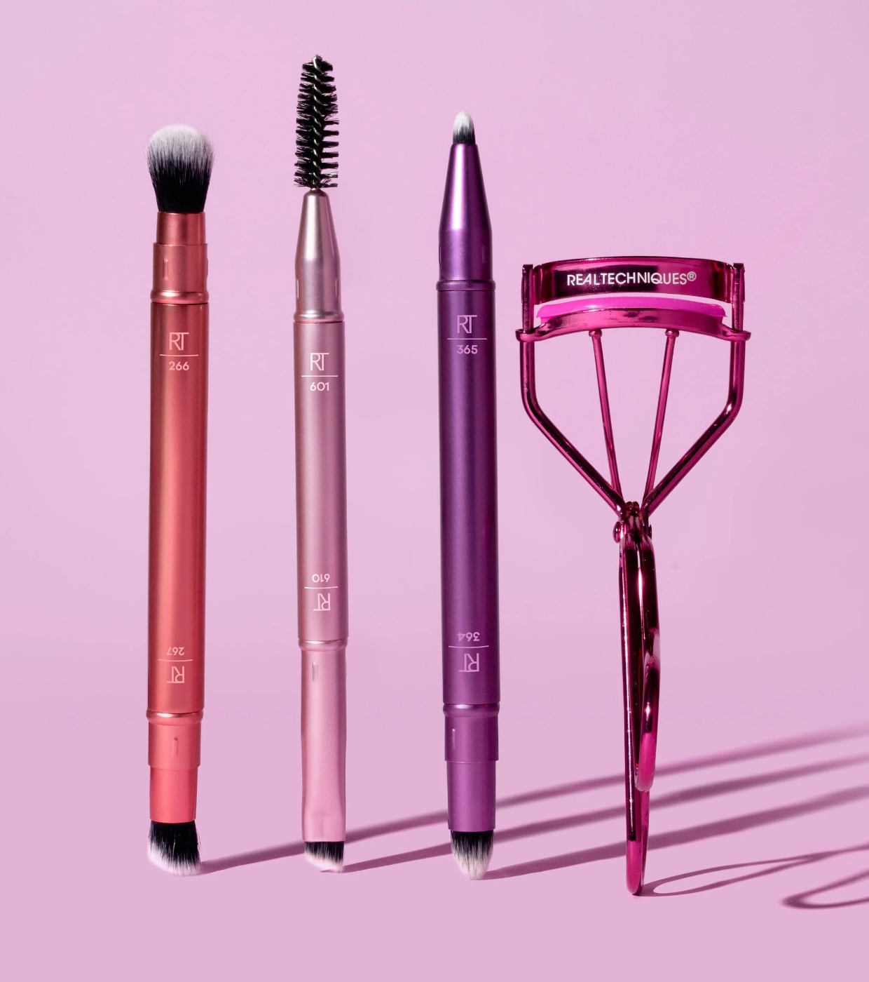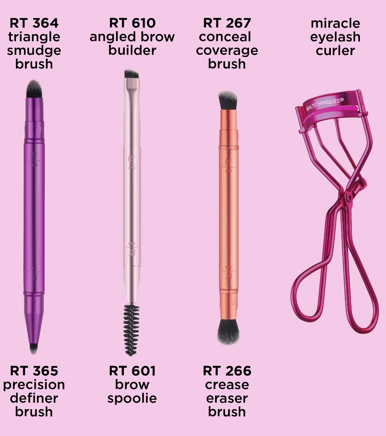 Cet ensemble de voyage tout-en-un Real Techniques Real Techniques comprend 3 pinceaux à double extrémité et un recourbe-cils Miracle, parfaits pour définir, estomper et perfectionner vos yeux en déplacement.