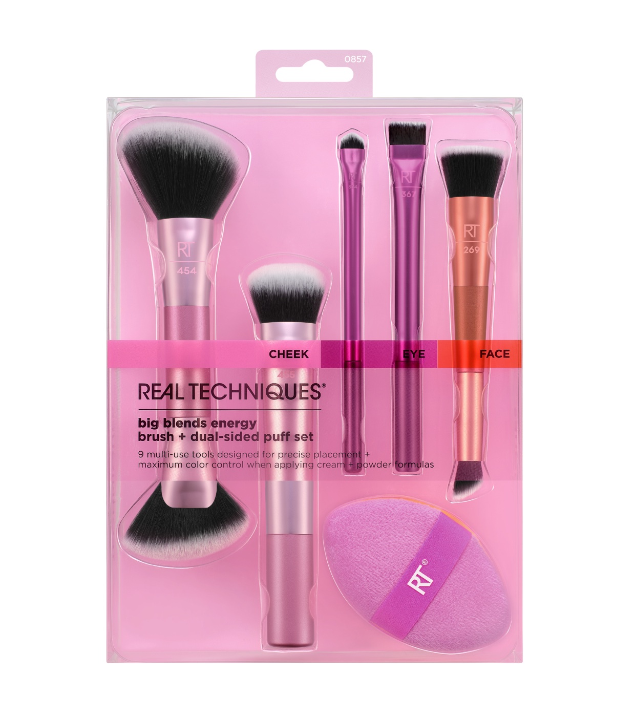 L' ensemble de pinceaux pour les yeux et le visage Real Techniques Big Blends Energy comprend 6 outils multifonctionnels conçus pour offrir une application précise et un contrôle maximal des couleurs.