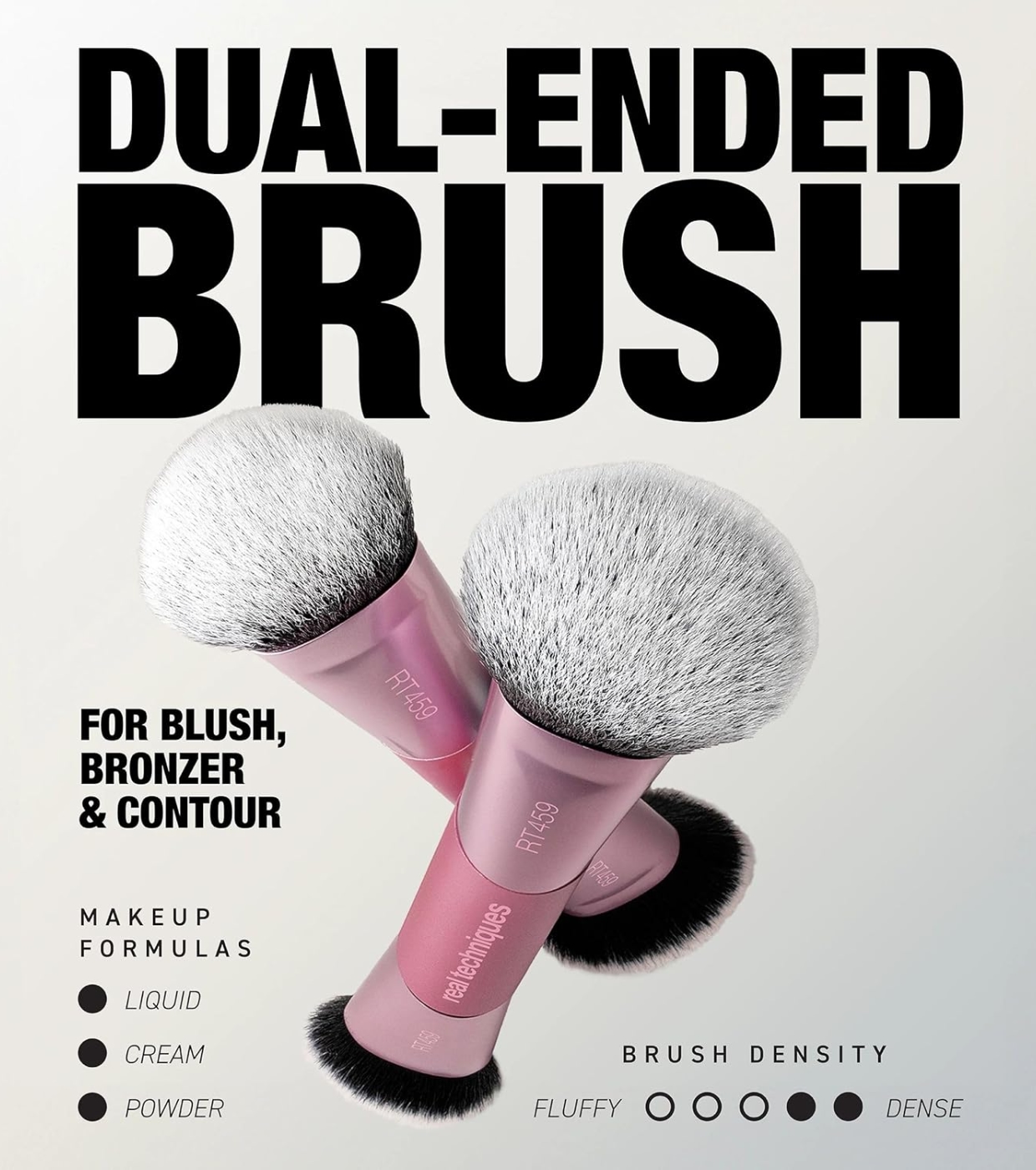 Sa conception comprend deux faces fonctionnelles : une extrémité dense et biseautée, idéale pour mélanger les produits crémeux ou liquides tels que le fond de teint, le contouring ou le blush, et une autre extrémité plus souple et duveteuse, parfaite pour appliquer et mélanger les produits en poudre avec un fini doux et naturel.