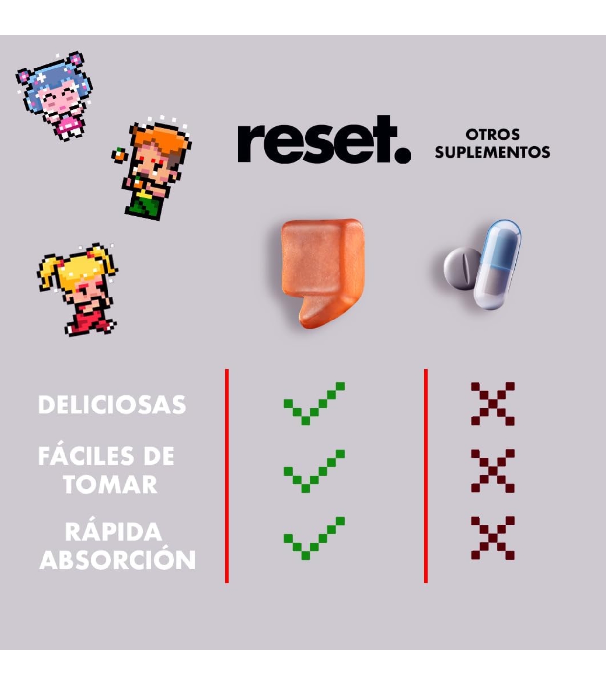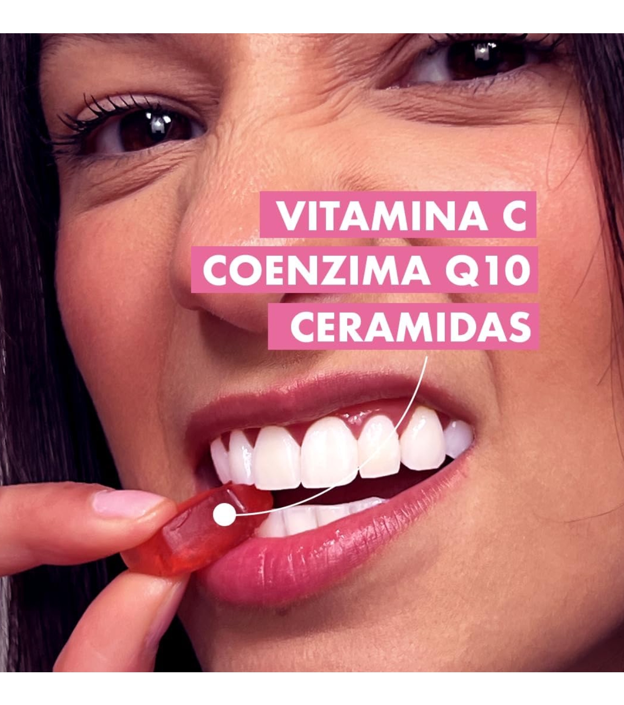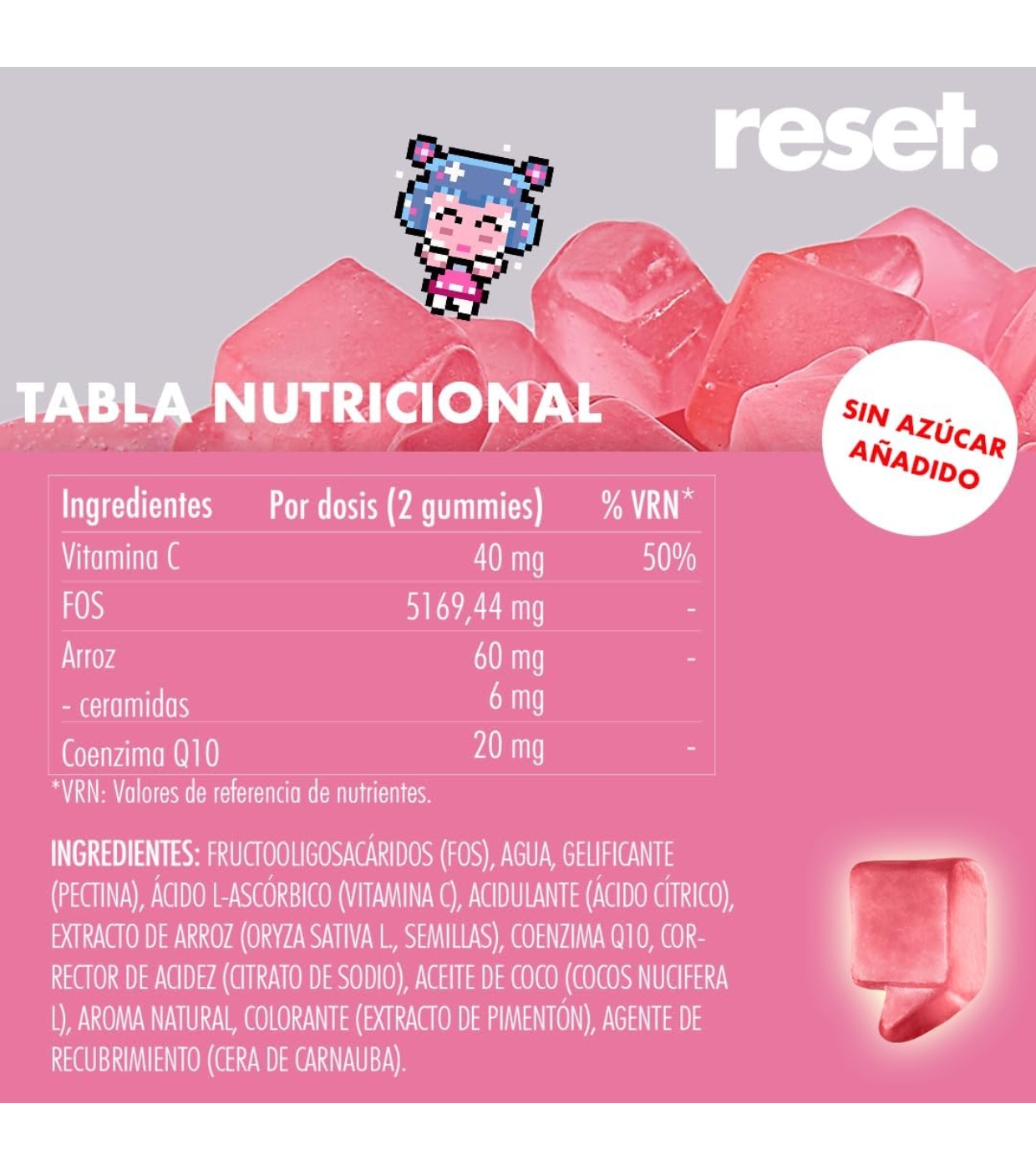 Fructooligosacáridos(FOS), agua, gelificante (pectina), ácido L-ascórbico (vitamina C), acidulante (ácido cítrico), extracto de arroz (Oryza sativa L., semillas), coenzima Q10, corrector de acidez (citrato de sodio), aceite de coco (cocos nucifera L), aroma natural, colorante (extracto de pimentón), agente de recubrimiento (cera de carnauba).