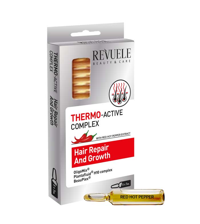 Complejo termo activo que ayuda a reparar el cabello dañado y ayuda a su crecimiento de Revuele.
