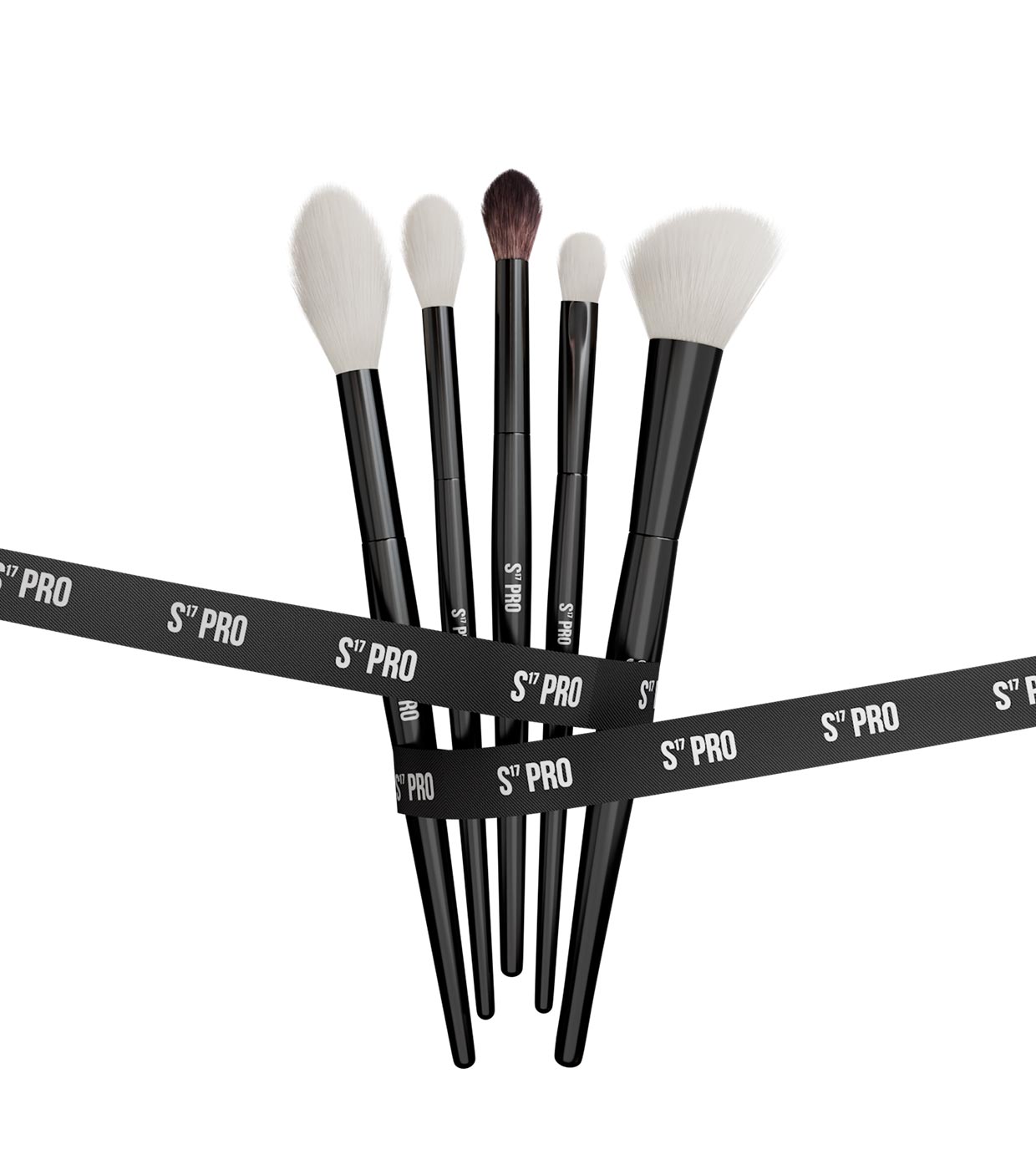 Une gamme de pinceaux de maquillage professionnels proposant des outils adaptés à chaque technique. Le maquillage est perçu comme un processus fluide et non rigide.