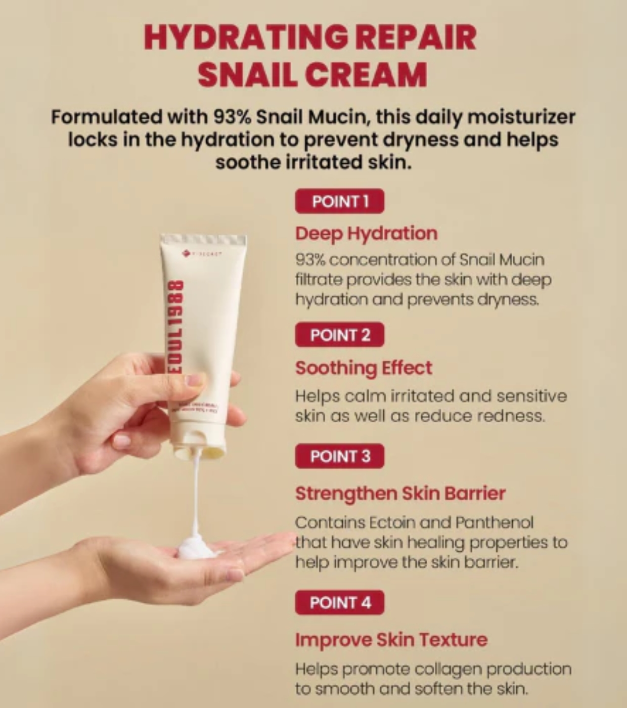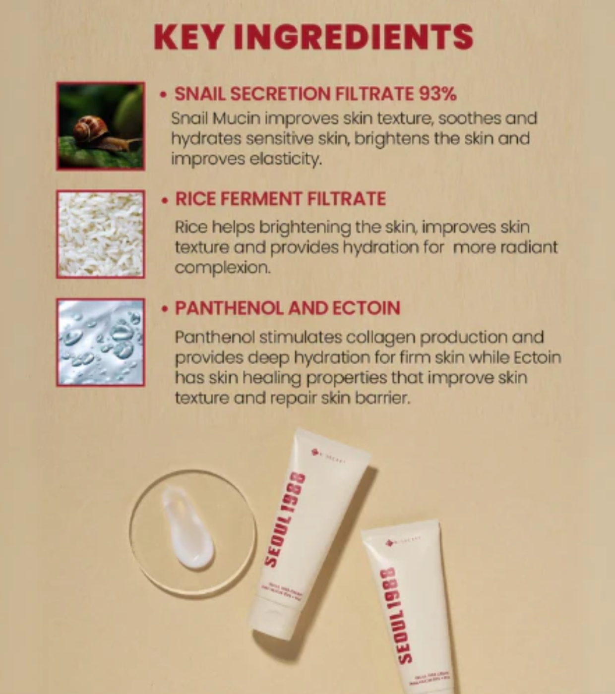 Snail Secretion Filtrate, Caprylic/Capric Triglyceride, 1,2-Hexanediol, Cetearyl Alcohol, Dimethicone, Water, Cetearyl Olivate, Carbomer, Arginine, Benzyl Glycol, Sorbitan Olivate, Oryza Sativa (Rice) Bran Water, Allantoin, Sodium Polyacrylate, Ethylhexylglycerin, Disodium EDTA, Butylene Glycol, Oryza Sativa (Rice) Extract, Rice Ferment Filtrate (Sake), Panthenol, Ectoin, Sodium Hyaluronate