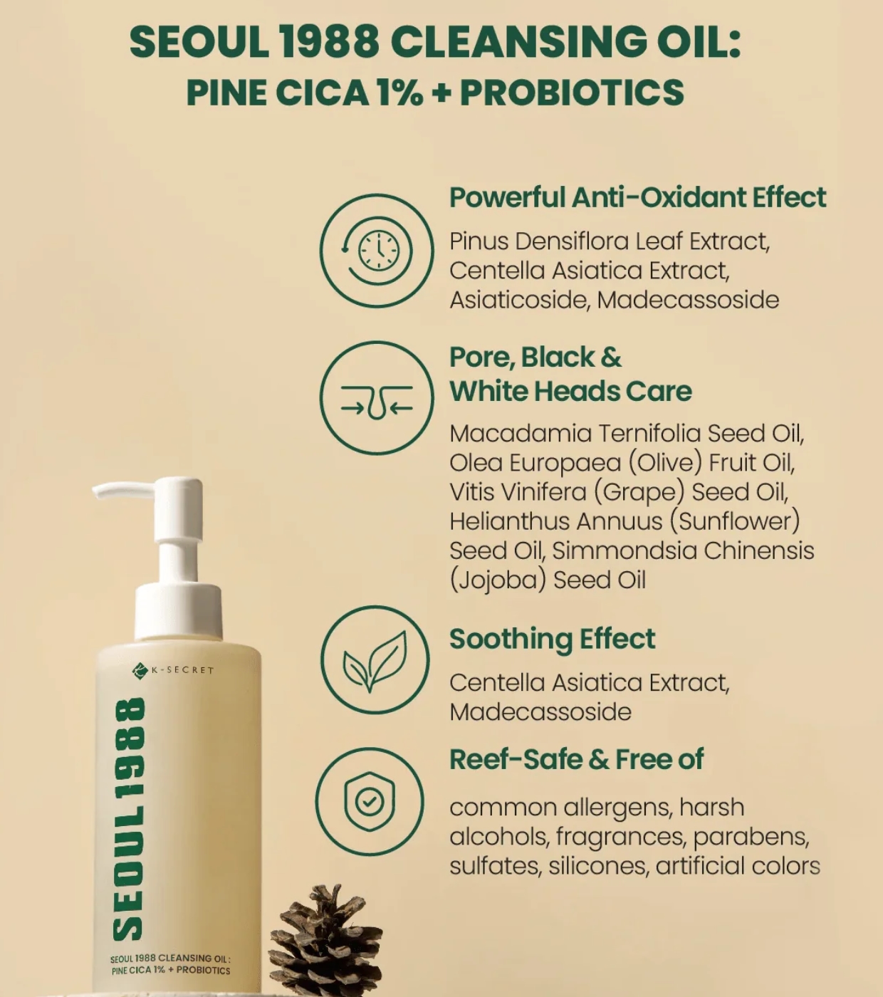 L' huile nettoyante K-SECRET SEOUL 1988 Cleansing Oil est une huile nettoyante douce mais très efficace, conçue pour éliminer le maquillage, la crème solaire, l'excès de sébum et les impuretés sans irriter la peau.