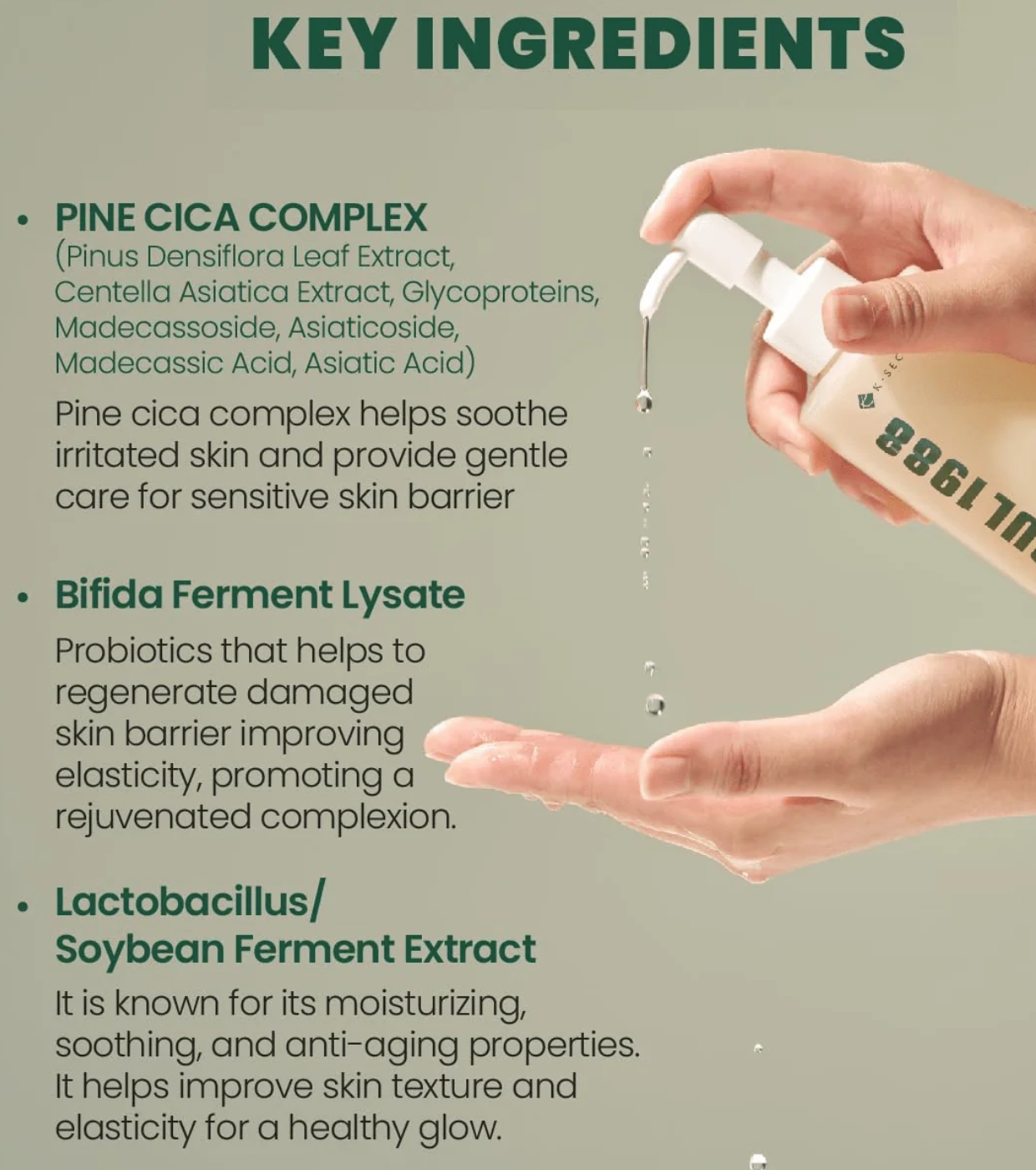 Enrichie à 1 % de cica de pin et de probiotiques, elle associe un nettoyage en profondeur à un effet apaisant et renforce la barrière cutanée, ce qui en fait un allié idéal pour les peaux sensibles, réactives ou à tendance acnéique.