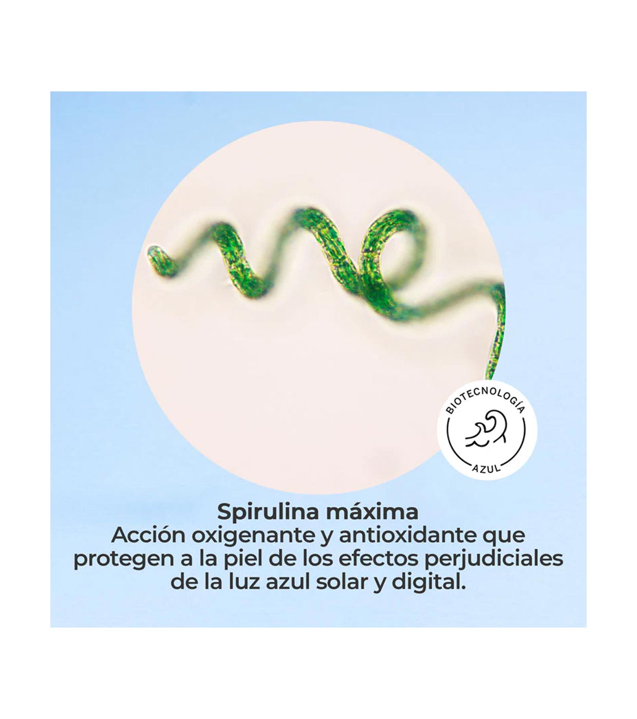 - Extrait d'algue spiruline : Contient des enzymes photolyases et des pigments bleus à action oxygénante et antioxydante qui protègent la peau des effets nocifs de la lumière bleue des écrans (HEV) et du soleil.