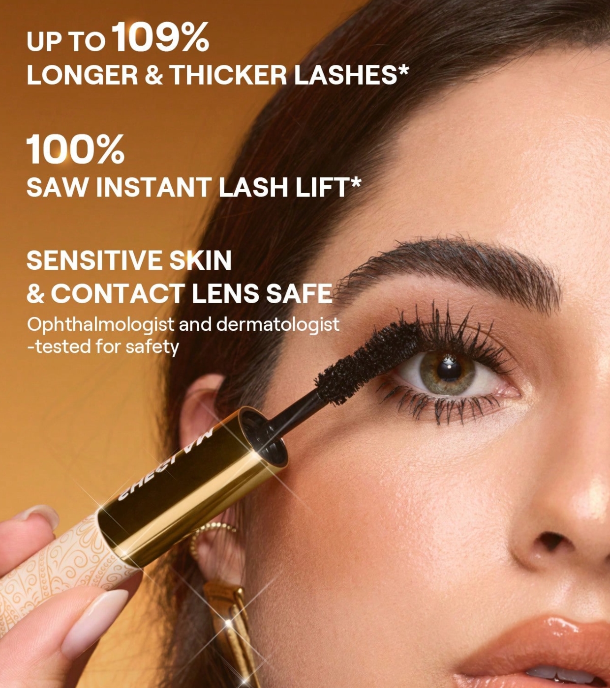 Des cils luxueux, plus fournis, recourbés et parfaitement définis. Un résultat sublime qui transforme votre regard d'une touche de glamour doré.