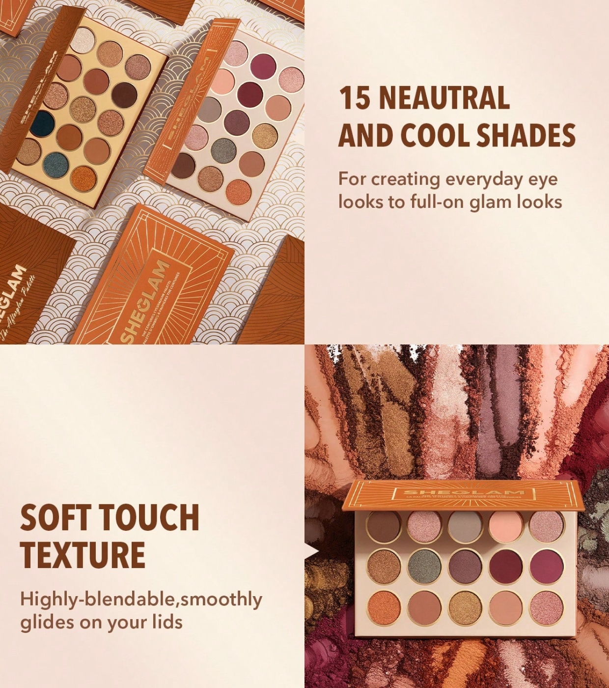 Découvrez votre nouvelle palette de fards à paupières Afterglow de SHEGLAM avec 15 teintes neutres et froides conçues pour créer tout, des looks élégants de tous les jours aux maquillages glamour et sophistiqués.