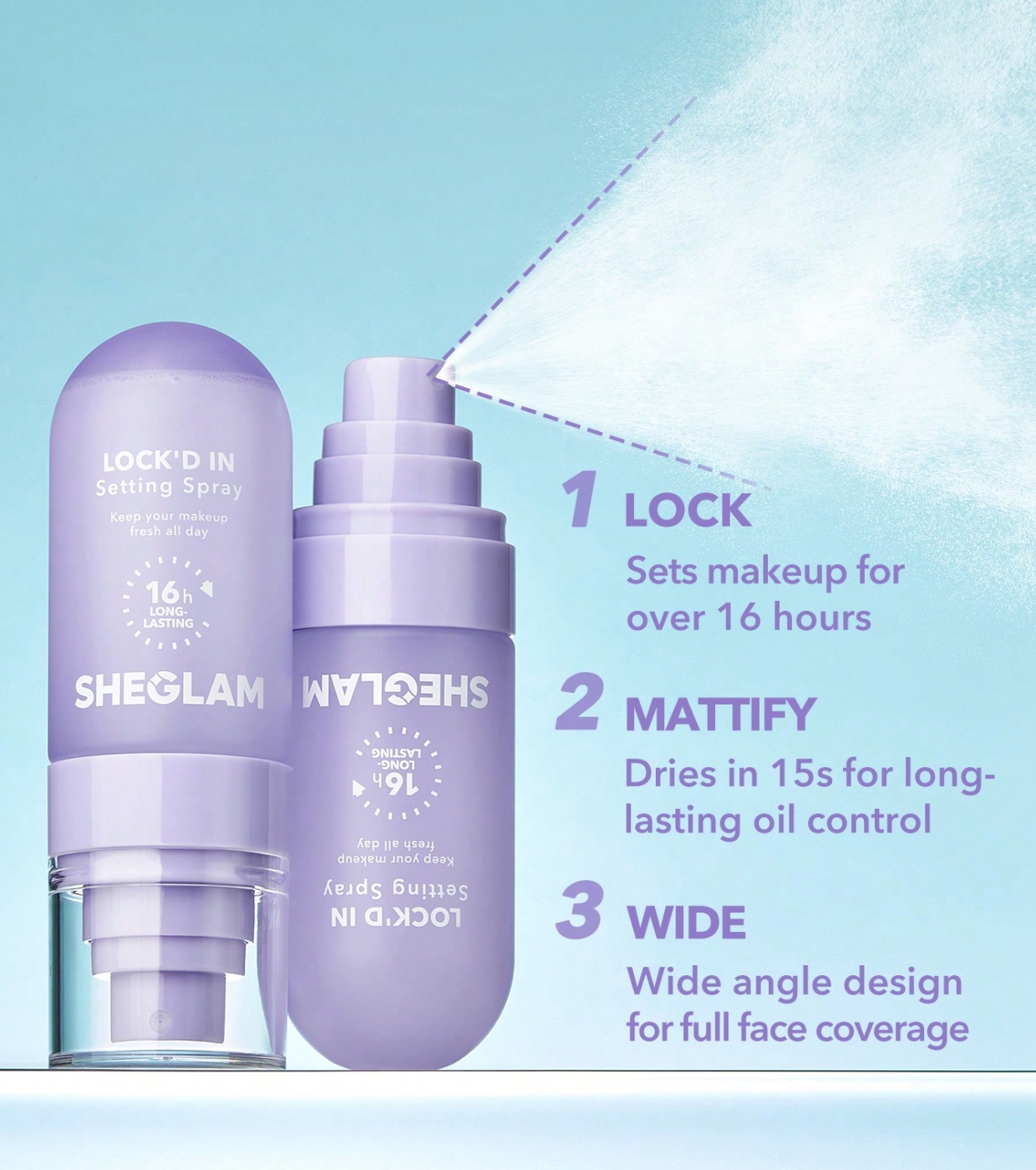 Gardez votre peau mate toute la journée grâce au spray fixateur longue tenue Lock'd de SHEGLAM , conçu pour fixer le maquillage tout en contrôlant l'excès de brillance.