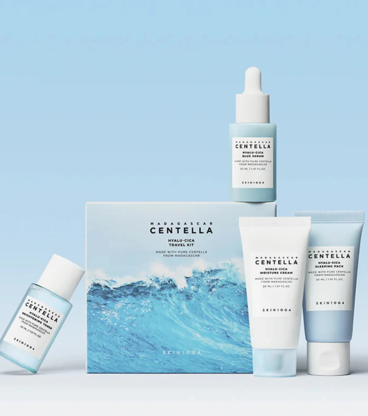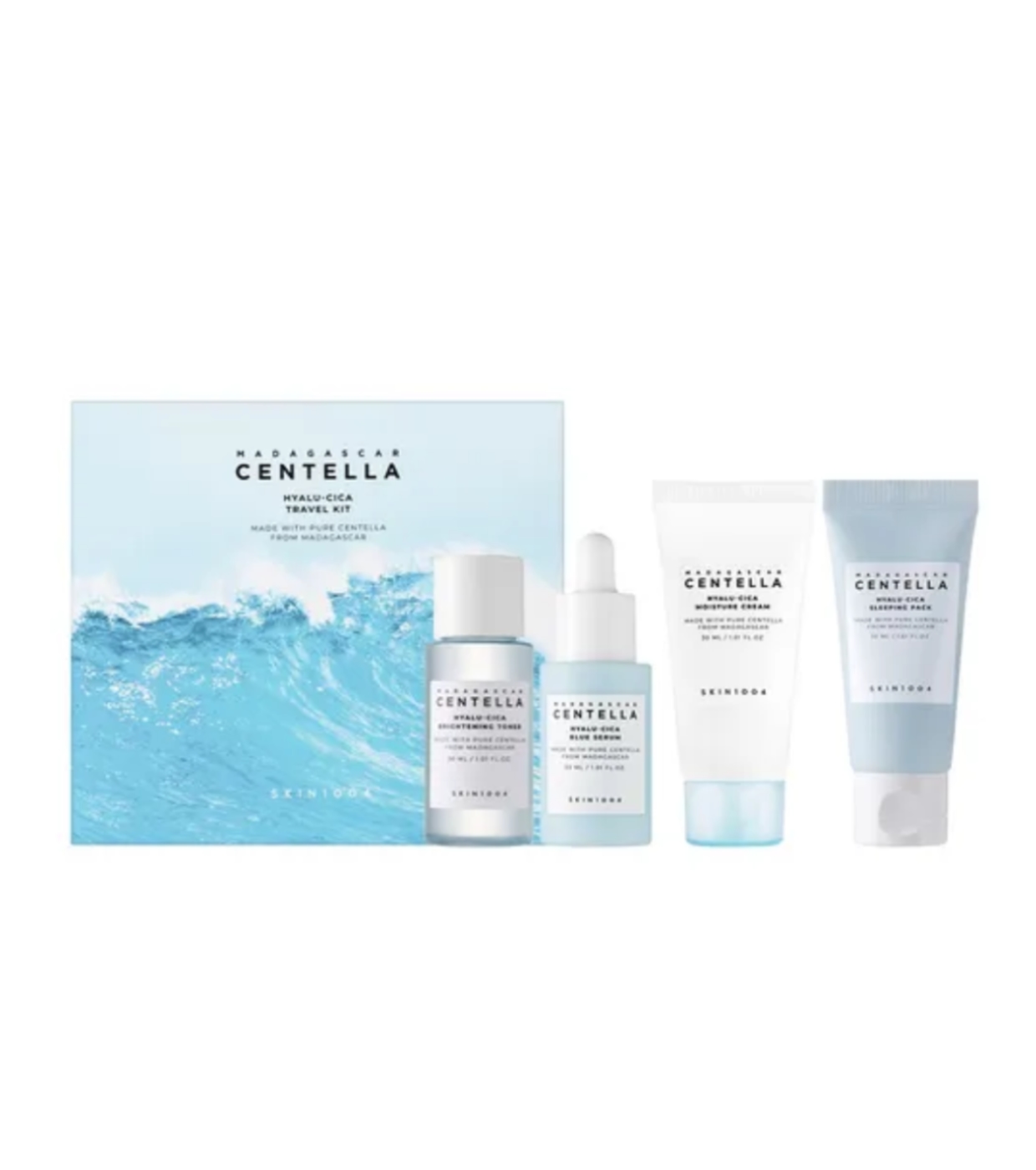 Découvrez la routine complète d'hydratation et d'apaisement avec le Madagascar Centella Hyalu-Cica Travel Kit de SKIN1004 , un mini-kit pratique idéal pour voyager ou essayer la gamme.