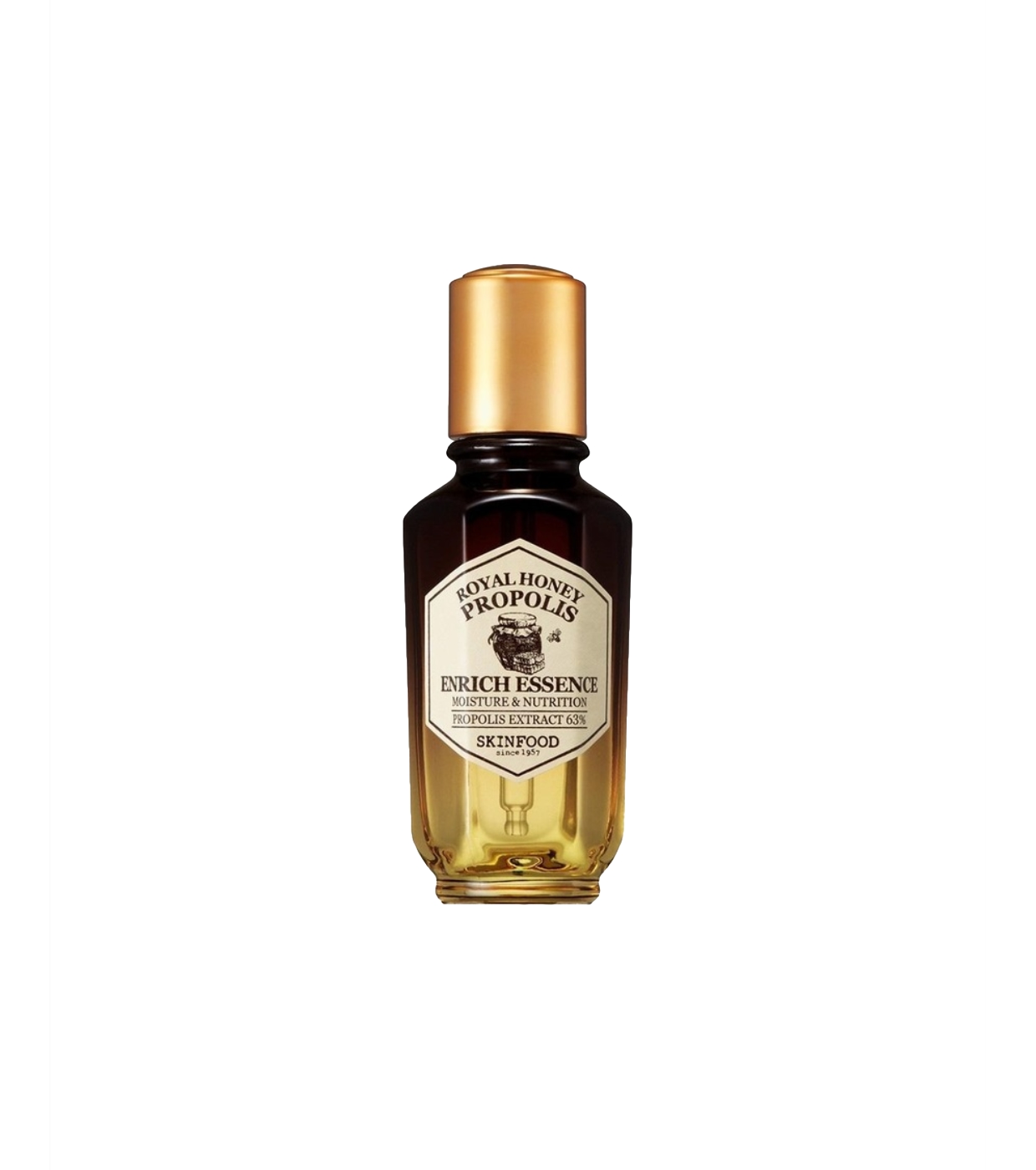 L'essence pour le visage SKINFOOD Royal Honey Propolis Enrich de SKINFOOD est une essence hautement concentrée formulée avec un puissant mélange de 63 % d'extrait de propolis d'abeille noire, 10 % de miel royal et 10 % de gelée royale.