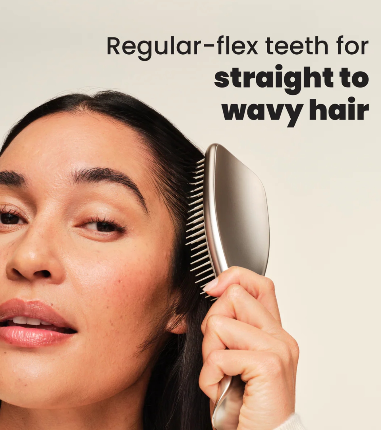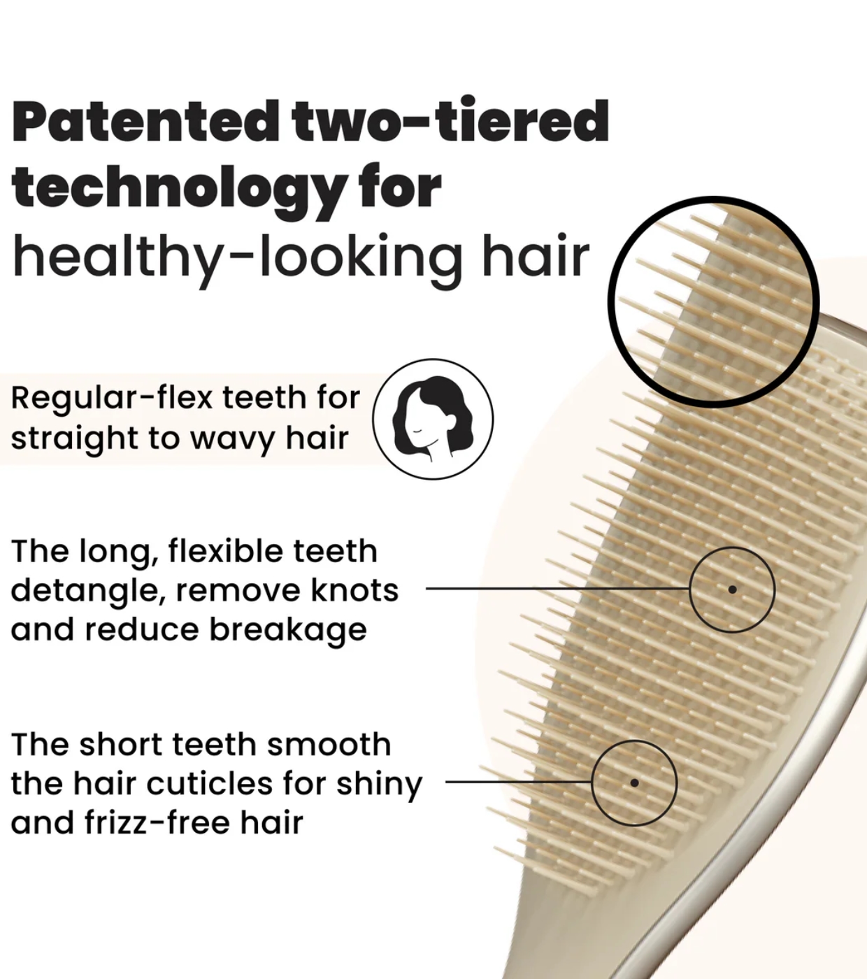 Avec ses 325 poils flexibles à deux niveaux, il démêle en douceur les cheveux mouillés ou secs, minimisant la casse et réduisant les frisottis.