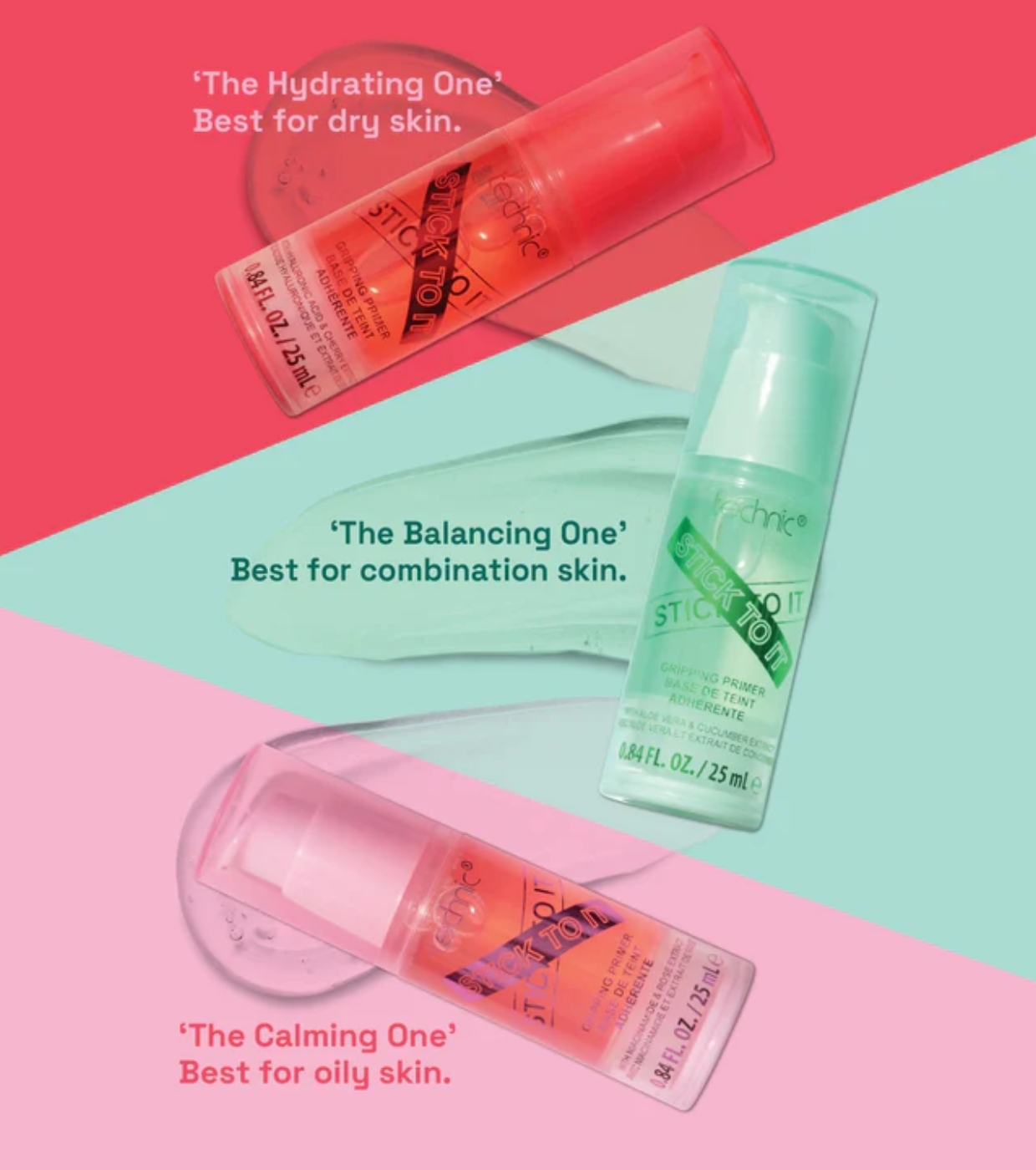 Formulé avec soin, Stick To It de Technic Cosmetics est disponible en trois formules de soin spécifiques, chacune conçue pour préparer votre visage, améliorer l'adhérence du maquillage et s'adapter parfaitement à votre type de peau.