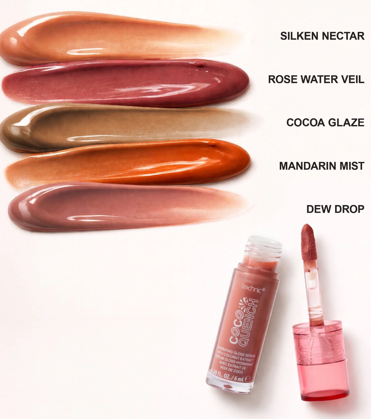 Ce gloss hydratant Coco Quench de Technic Cosmetics , enrichi en beurre de cacao, offre une couleur riche et vibrante dès la première application.