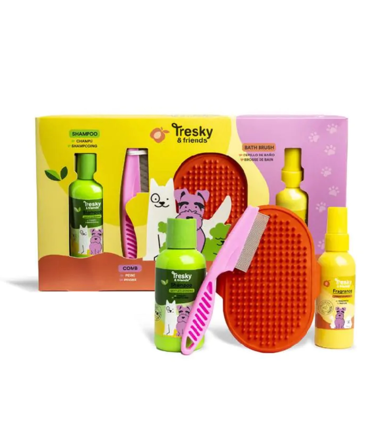 Transformez le bain de votre chien en une expérience de bien-être complète grâce à cet ensemble Tresky & Friends conçu pour apaiser sa peau et garder son pelage propre, doux et brillant.