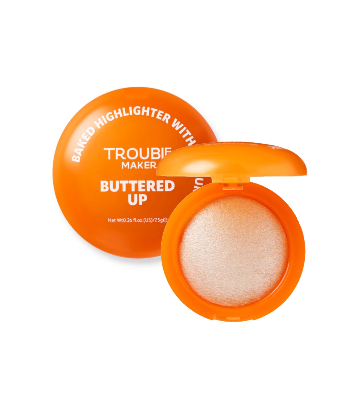 Le Buttered Up Baked Highlight de Trouble Maker est un enlumineur cuit qui donne à la peau un éclat chaud, doux et lumineux, avec un fini beurré et soyeux qui se fond parfaitement au visage.