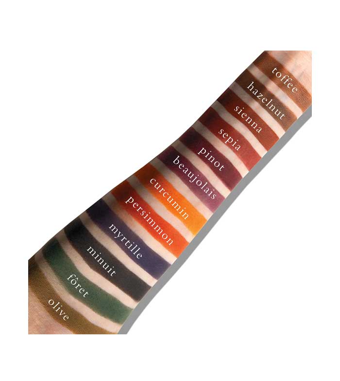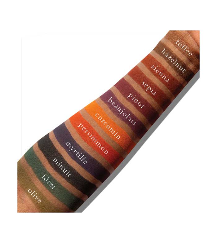 Shade 10 (Minuit): Talc, Octyldodecyl Stearoyl Stearate, Mica, Zinc Stearate. Shades 1 (Toffee), 2 (Hazelnut), 3 (Sienna), 4 (Sepia), 5 (Merlot), 6 (Beaujolais), 7 (Curcumin), 8 (Persimmon), 9 (Myrtille), 11 (Fôret), 12 (Olive): Talc, Mica, Octyldodecyl Stearoyl Stearate, Zinc Stearate. Vegan Shades: 1,2,7,11. (+/- may contain: Titanium Dioxide CI 77891, Iron Oxides CI 77491/CI 77492/CI 77499, Carmine 75470, Ultramarine Blue CI 77007, Yellow 5 CI 19140, Ferric Ferrocyanide CI 77510, Black 2 CI 77266, Blue 1 CI 42090)