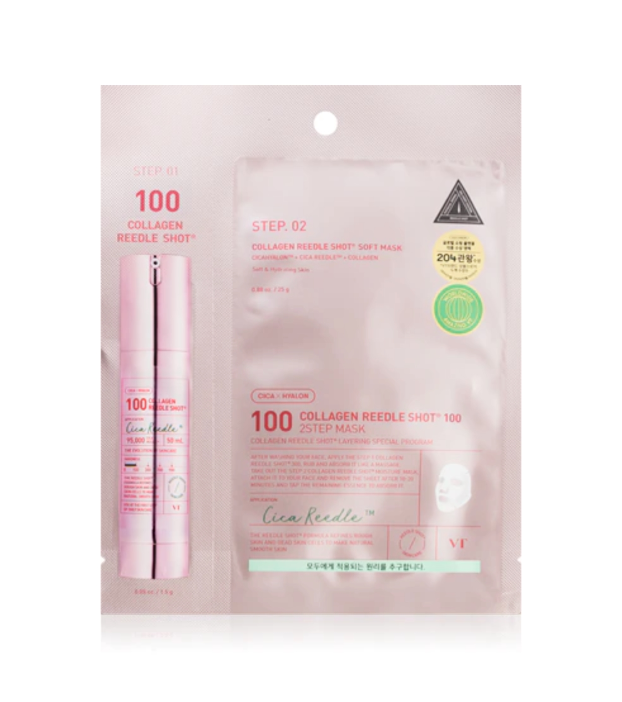 Ce masque en 2 étapes 2-Step Collagen Reddle Shot 100 de VT Cosmetics avec la technologie Collagen Reedle Shot est conçu pour raffermir, revitaliser et améliorer l'élasticité de la peau, offrant un effet plus lisse et plus volumineux dès la première utilisation.