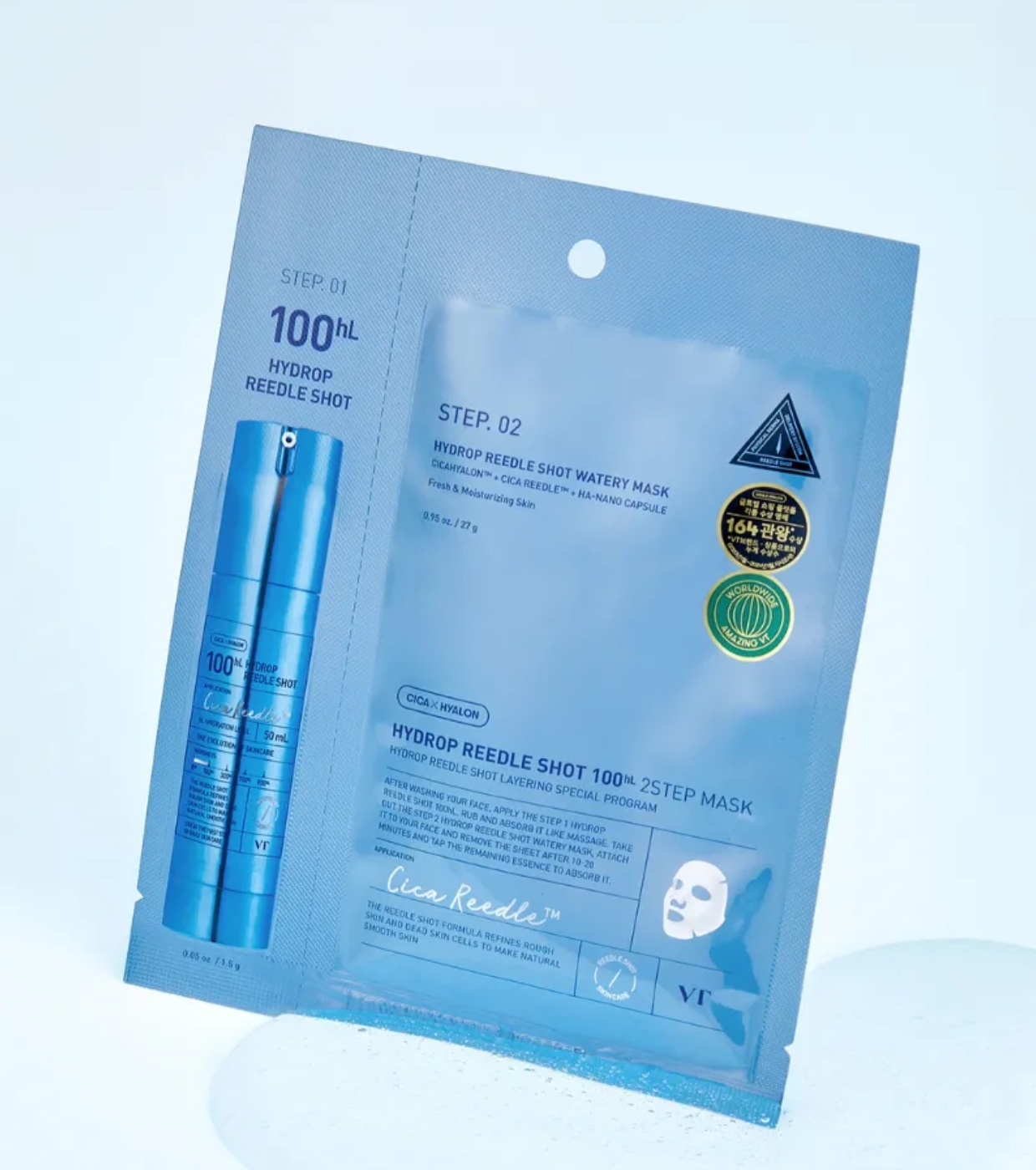 Ce masque en 2 étapes 2-Step Hydrop Reedle Shot 100 de VT Cosmetics avec la technologie Hydrop Reedle Shot est conçu pour hydrater intensément de l'intérieur et améliorer l'absorption des ingrédients actifs, aidant ainsi à restaurer une peau plus saine et plus équilibrée.