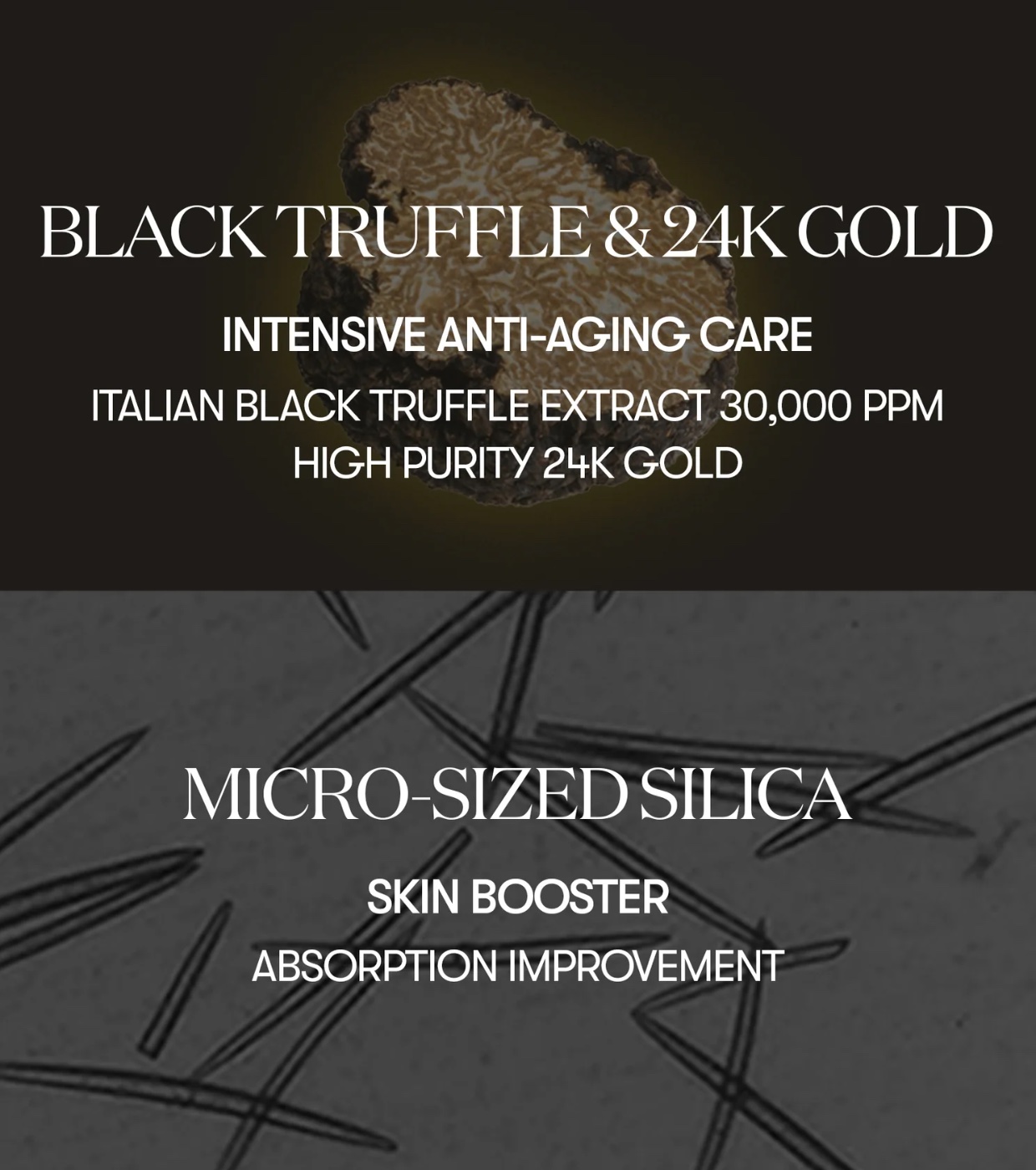 Water, Butylene Glycol, Water, Tuber Melanosporum Extract, Glycerin, Methylpropanediol, Tripropylene Glycol, Niacinamide, Octyldodecanol, Butylene Glycol, Sodium Acrylate/Sodium Acryloyldimethyl Taurate Copolymer, Water, Polyisobutene, Sorbitan Oleate, Caprylyl/Capryl Glucoside, C9-12 Alkane, Dimethiconol, 1,2-Hexanediol, Sodium Polyacrylate, Acrylates/C10-30 Alkyl Acrylate Crosspolymer, Polyacrylate Crosspolymer-6, Arginine, Silica, Centella Asiatica Extract, Hydroxyacetophenone, Water, Butylene Glycol, Tuber Magnatum Extract, Ethylhexylglycerin, Caprylyl Glycol, Adenosine, Xanthan Gum, Panthenol, Tocopherol, Water, 1,2-Hexanediol, Hydrogenated Lecithin, Ceramide NP, Glycosphingolipids, Water, Butylene Glycol, Collagen, Water, 1,2-Hexanediol, Centella Asiatica Extract, Sodium Hyaluronate, Madecassic Acid, Madecassoside, Propolis Extract, Asiaticoside, Asiatic Acid, Malt Extract, Water, Water, Propanediol, 1,2-Hexanediol, Cyanocobalamin, Ethylhexylglycerin, Gold (Ci 77480), Butylene Glycol, Hydroxypropyl Tetrahydropyrantriol, Water