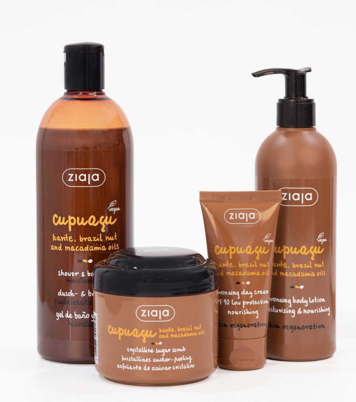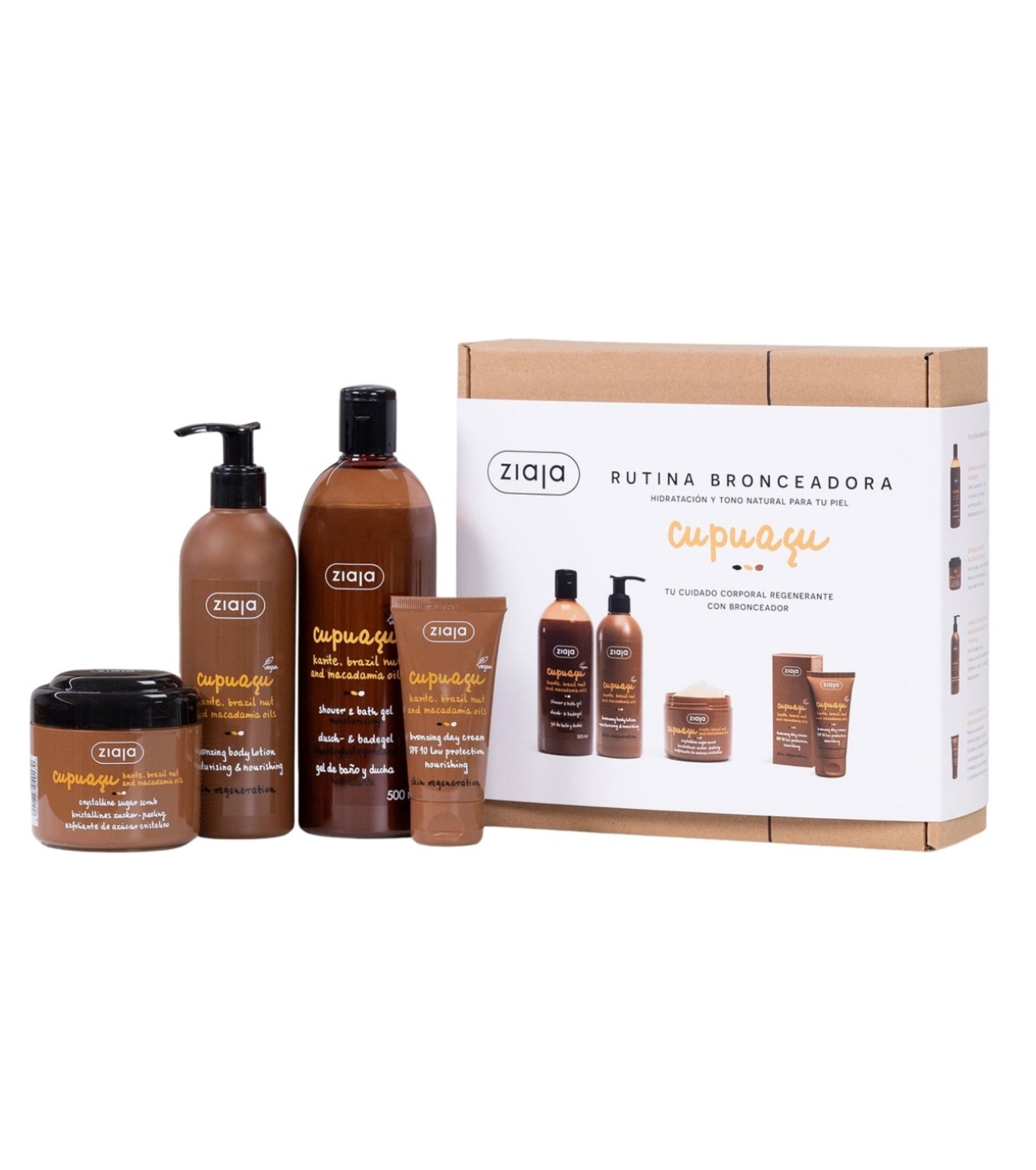 Le coffret de bronzage Cupuaçu de Ziaja réunit quatre produits de soin du corps essentiels qui hydratent, régénèrent et améliorent la texture de la peau tout en offrant un bronzage naturel et uniforme sur le visage et le corps.